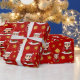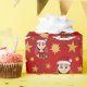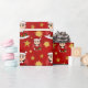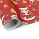 Christmas wrapping paper with an illustration of a cute smiling happy girl with short black hair, she is wearing red and white Santa Claus costume and holding a present; with editable text template for your name or message, Christmas holidays design with a red background