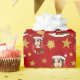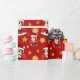 Christmas wrapping paper with an illustration of a cute smiling happy girl with long brown hair, she is wearing red and white Santa Claus costume and holding a present; Christmas holidays design with a seamless red background with stars