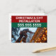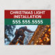 Customize your own Christmas light installation business marketing postcards by putting your company name or message in red and green with your phone number above the photograph of someone on a ladder putting up holiday lights in the winter.