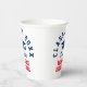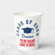 Custom class of 2025 high school graduation party Paper Cups. Personalize with your own name. Double sided print with tassel cap logo. Disposable party supplies for graduate celebrations. Customizable blue and red colours.