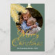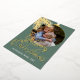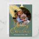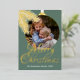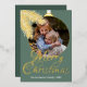 Contemporary classic Christmas holiday season greeting card with white coloured pine tree needles wreath leaves pattern on a classy green grey background, with real gold foil Merry Christmas wish text. With option and room to customize the text, family name and year date, and add a personal photo of your choice on the front, and a customizable season greeting message on the backside of the card.