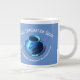 This 20-ounce specialty jumbo mug is great for any coffee lover. It features my digitally altered close-up photograph of a coffee filled blue cup and saucer with coffee beans over a black background on both sides. The arched white template text above the photograph reads "Coffee Consumption Squad" which you can change. You can also personalize the bowed white text below the cup and saucer photo with a name or remove the text. Fill in the template fields to change the text on both sides or click customize to select a font style, size, and colour you like.