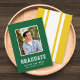 This varsity style photo graduation announcement card has editable background colors. To change the front background color, select the "GraduationFront2" layer and change its color. To change the back background color, simple select background and change the color.This a great way to match your announcement to your school colors.