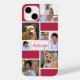 Create your own personalized, custom colour photo cell phone case featuring a colour block design in your choice of colours (shown in magenta rose pink), 7 pictures and your name, monogram or other text in your choice of font styles and colour (shown in modern hand lettered typography). PHONE OPTIONS: The sample is shown on the iPhone 14 model and Barely There case style--other phone models and case style are shown on the ordering page. ASSISTANCE: For help with design modification or personalization, colour change or resizing for another phone style, contact the designer before ordering via Zazzle Chat or email makeitaboutyoustore@gmail.com.