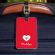 This monogram modern luggage tag features a modern script for your name and a white heart against an editable background colour on the front (click edit to change).