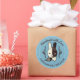 Super cute black and white winking bunny rabbit holding a crochet hook in its teeth and a ball of yarn at its feet on this handmade-with-love sticker or package label for crocheted projects like cute animal stuffies. Choose your own background colour.