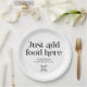 Fun party plates for your next company event or get-together with the phrase "just add food here", cusotmizable with your company name/event and logo.