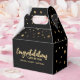 The design features a captivating hand-lettered script typography for the word "Congratulations," exuding a sense of excitement and joy. Surrounding the box, faux printed gold confetti dots add a touch of glamour and celebration, making these favour boxes truly eye-catching.