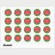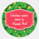 Cute and festive holiday stickers with text ready for you to edit. The background has a pattern of fun Christmas trees with gold stars, and the centre medallion is brilliant scarlet red with white text.