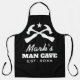 Custom cool manly man cave BBQ apron for guys. Personalized cooking aprons in any colour. Bold template with masculine hammer tool logo. Add your own name or quote. Create your own unique Birthday party gift for dad, uncle, husband, friend, boyfriend, father, grandpa, boss, co worker, chef, cook, colleague, carpenter, builder, construction worker, handyman etc. Available in small, medium and large size. Also great for Father's Day! Kitchen aprons for men. Also fun for arts, crafts, beer brewing, carpentry and more.