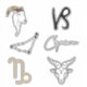 Astrology symbols of zodiac sign Capricorn in a custom cut vinyl sticker page with six individual images. Unique line ink and colour drawing, symbols in black and gold, black constellation, and Capricorn text in a dark script font.