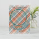 Unique, classic, cute and decorative Holiday season greeting card. With fun Happy Thanksgiving wish on a cozy warm colourful teal blue and orange red coloured plaid tartan pattern. With room to customize or personalize with your own cheerful photo and family name on the front of the card, and a customizable season greeting poem on the backside of the card with option for family member names.