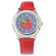 Adorable cartoon strawberry with smiley face on blue and red personalised kid's watch with easy to read numbers.