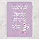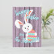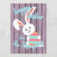 Pretty, trendy and modern 'Happy Easter' Spring season wish on a light spring lavender violet periwinkle coloured rustic farmhouse wooden planks style background, and a cute smiling bunny rabbit holding a colourful easter egg. With room to customize or personalize with your family name and text of your choice on the front, and a heartfelt poem message and personal names on the backside that can easily be personalized or customized with your own greeting text.
