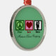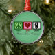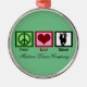 A peace sign, heart, and a couple participating in a dance. Peace Love Dance Christmas ornament personalized with your company name or text.