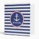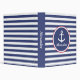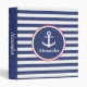 A white boat anchor is on the front of the binder. Under the ship's anchor, you can personalize the binder with the recipient's name in white text. The background on this nautical-themed binder is dark blue and white stripes.