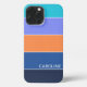 Contemporary classic dark azure blue, salmon orange, violet purple, and aqua turquoise green coloured block stripes pattern design. With room to customize with the name of your choice. Beautiful, modern, and cool cover for the trend-savvy and art-loving hip trendsetter, artsy motif lover who wants to protect their phone from dust and dirt, wear and tear. This design is available in Apple iPhone 6, 7, and 8 Plus, 10 or X, XR, XS, 11, 12, 13 Mini, 14, 15 Plus, and Pro Max cellphone cases. Show off your style, look fashionable trendy, and feel stylish with a unique design on a mobile device accessory of your choice.