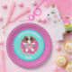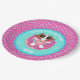 This custom birthday party plate features Sophie, a brown and white cartoon dog, relaxing on a inflatable pool float in the shape of a doughnut. Sophie is wearing sun glasses and is wearing a pink swimsuit with a pineapple design on it. Party plates have a wavy pattern and sparkles as accents. The party plate has tones of aqua, purple, bright pink, white and mint green.
