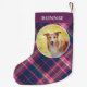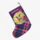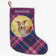 Treat your dog this holiday season to their own custom photo Christmas stocking. Your chosen photo of your pet will appear in a round 'frame' upon a stylish plaid patterned background. This elegant design combines navy blue, magenta pink and muted golden tones, inspired by traditional tartan patterns of the Scottish Highlands. With space for your pet’s name in pride of place at the top, the personalized stocking adds warmth and charm to your festive decor, by the fireplace or under the tree. A fun way to include your dog in your Christmas traditions. Simple click 'Personalize', and add your pet’s photo and name to create a unique keepsake and fun festive accessory.