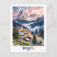 This watercolor travel artwork captures the serene beauty of a mountain village nestled amidst the iconic Dolomites in northeastern Italy. Snow-capped peaks of the Italian Alps rise dramatically above a cozy cluster of alpine homes, church spire, and twilight forests, rendered in soft pastel hues and painterly tones. This vintage-style design channels the charm of historic European postcards, celebrating Italy travel, mountain landscapes, and unforgettable vacation memories.