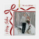 This double-sided Christmas ornament lets you feature a different photo on each side or use the same one for a coordinated look. A hand-drawn red bow sits in the top left, with ribbon lines running across the top and down the left edge for a simple decorative touch. “Merry Christmas” appears vertically along the bottom left, with the date just beneath it, and your name in the top right for a balanced layout.
