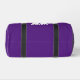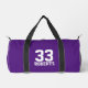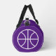 Custom duffle bag for basket ball team player. Handy for balls, towel and other equipment. Also great for other sports, fitness, gym, training, travel etc. Available in small and large sizes. Purple example. Personalize with name and jersey number.