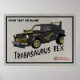 A computer-generated, black and gold, image of a customized East German Trabant automobile. The customized car's nickname, Trabasaurus rex, in an appropriate font, appears both on the vehicle door and below the image. The vehicle bears an Idaho license plate reading "TRABI REX" as it was customized by mythical Warsaw Pact Wonder Wheels (Classic Commie Cars) in Sandpoint. Add your own additional text.