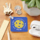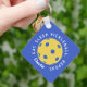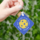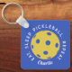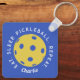 Custom Eat Sleep Repeat Pickleball Keychain features a blue background with a yellow pickleball in the centre of the keychain with the saying "eat sleep repeat pickleball wrapped around the ball. Personalize it with your name or initials in a script font. A great gift for a coach or pickleball enthusiast.