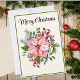 Large watercolor illustrated pink poinsettia bouquet with berries and foliage on front, with a matching small poinsettia swag on back, decorate this standard 5"x7" flat Christmas card with a "floral white" background and green border. Easily change, add-to or remove the stylish script text to make it yours using the Template provided. Your choice of other sizes, paper types and envelope.