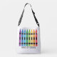 This elementary school tote bag is a vibrant and cheerful accessory, perfect for carrying books, supplies, and snacks to school. On one side, a colourful rainbow line of crayons stretches across the bag, adding a playful and artistic touch. Each crayon is distinct, boasting a spectrum of hues, from fiery reds to cool blues and sunny yellows.