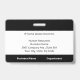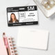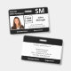 Horizontal custom photo ID badges feature your employee's photo, name, professional job abbreviation and job title, ID number, business logo and name. You can also include a department if you like. Perfect for any profession. On the back you can add more information, such as where to return the badge if it gets lost. Customize it with a photo, any shape logo, and custom text in the sidebar. The square photo on the left has a thin white border surrounded by black stripes across the top and bottom and thin black lines by its sides. A white block on the centre right side highlights the logo, job title, ID number, and expiration date in black text. The staff person's name, job initials, and hospital or business text is white on black.