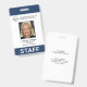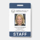 Corporate photo ID badge in a vertical layout. This simple yet professional design features a navy blue border on the top and bottom with white in the middle. The template is personalized with your logo, company name, employee name, title, department / location and employee ID. The bottom border has "STAFF" in large bold letters and may be changed to any title desired. The backside has your contact information and instructions for returning if found. This classic design works great for any type of business.