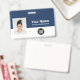 Easily personalize this Custom Employee Name Badge with Photo, Scan Bar Code and business logo, with lanyard included. A simple business design in navy blue and white colours fully customizable in front and back sizes, sans-serif basic and modern fonts and a professional and clear look. Avaiable with or without lanyard, metal clip or with retractable. No minimum order.