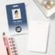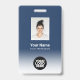 Easily personalize this Custom Employee Name Badge with Photo, Scan Bar Code and business logo featuring a white ombre gradient on background colour. A simple business design in navy blue and white colours fully customizable in front and back sizes, sans-serif basic and modern fonts and a professional and clear look. Avaiable with lanyard, metal clip or with retractable. No minimum order.