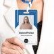 You can customize these medical employee badges with a personnel photo and name, along with multiple fields for title, floor or unit, title appreciations, employee ID number, and valid date or you can leave any field blank. The hospital name or facility appears at the top in bold lettering. On the backside, you can add your barcode if needed along with a return if lost information.