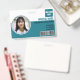 This horizontal medical photo ID badge features a modern white and light blue design with round customizable photograph.