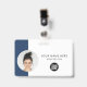 Easily personalize this Custom Horizontal Business Minimalist Employee Name Badge with Photo, Scan Qr Code or Scan Bar Code and business logo. A simple business design with round photo, in navy blue and white colours fully customizable in front and back sizes, sans-serif basic and modern fonts and a professional and clear look. Avaiable with lanyard, metal clip or with retractable. No minimum order.