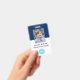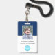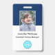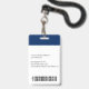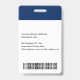 Create your own custom, personalized, durable PVC plastic, won't fade or tear, cool modern trendy navy blue and white, name photo ID badge, with choice of attachments - lanyard, metal clip, retractable, or none. To personalize, enter the name of the employee / staff / executive, their designation, and any additional information like employee ID, issue & expiry date of the badge, if lost return to & the address, etc. Next add the photo of the employee / staff / executive, add the business / company logo, and add the barcode. While you type/design, you'll be able to see a preview of your badge, throughout. Great for small business, corporate, school, restaurant, office, concert, retail, hospital, clinic, and for employee, staff, doctor, teacher, student.