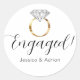These custom stickers say Engaged! along with a gold banded white diamond engagement ring and the bride and grooms names on the bottom. Perfect for an engagement party!