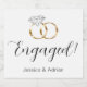 These custom sparkling wine labels say Engaged! along with a pair of gold banded white diamond engagement rings, and the bride and grooms names. Perfect for an engagement party!
