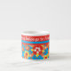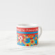 An Espresso Coffee Mug to personalise with a cheerful all-over pattern of red, orange and yellow flowers on a bright turquoise background, from a handpainted paper collage by Judy Adamson.