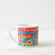 An Espresso Coffee Mug to personalise with a cheerful all-over pattern of red, orange and yellow flowers on a bright turquoise background, from a handpainted paper collage by Judy Adamson.