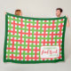 This cozy and colourful Summer Food Truck Festival picnic blanket features the signature Watermelon Red, Grass Green, and White picnic-check pattern with forrest green edge with a small white rectangle panel showcasing the official event design for clear visibility and branding.