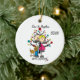 A cute, fun ceramic ornament featuring a stick figure expectant couple, a dog, holiday tree, and text that reads "We're Expecting!" with an area you can add your names or surname and the add the current year!