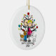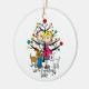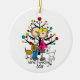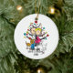 A cute, fun ceramic ornament featuring a stick figure expectant couple, a brown dog and a white dog, holiday tree, and text that reads "We're Expecting!" with an area you can add the current year!