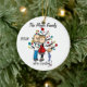 A pretty round ceramic keepsake Christmas holiday ornament features a stick figure couple expecting a baby and a small toddler boy standing in front of a decorated Christmas tree, and text that reads "We're Expecting!". You can personalize this cute stick figure ornament by adding your names and current year!