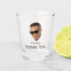 Custom bachelor party shot glass personalized with a name and featuring a custom photo (to make a face cut-out, you can edit the design and use Zazzle's remove background tool, or use any design app and upload a transparent png file). Ideal for the party and as favours for your groomsmen.