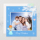 Custom family, white pine and cute angel on light blue Christmas Greeting Card.