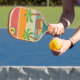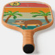 Outdoorsy Sloth retro themed paddle features a spot to add in your family initial. This pickleball paddle features a bold retro design with red, orange and yellow sunset.