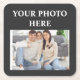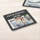 Square coaster featuring a dark base and a central photo insert. The design is minimalist, with the text "YOUR PHOTO HERE" framing a sample image of a happy family. It is a functional home accessory that allows you to keep precious memories close at hand on your table or desk.